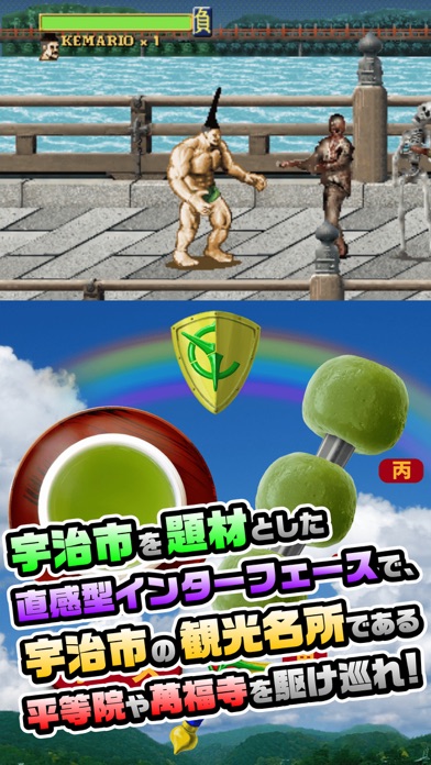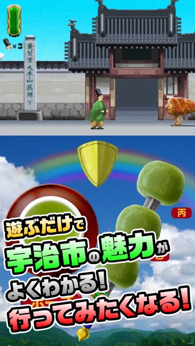 世界初!?宇治市を舞台にした横スクロールアクションゲーム!あなたの手のひらで宇治の魅力が炸裂!宇治市にある実際の観光名所や名産品を盛り込んだ完全オリジナルゲーム。遊ぶだけで宇治市の魅力がよくわかる!行ってみたくなる!さらに、直感的宇治市系インターフェースを搭載!コントローラーには、タップするたびに波紋がひろがる雅な「湯呑みカーソル」や、本物の茶団子の写真をもとに制作された、タップするたびプルプルとふるえる「茶団子ボタン」を搭載!さらに、背景は宇治川にかかる朝霧橋から望む景色!宇治市を題材とした直感型インターフェースで、宇治市の観光名所である平等院や萬福寺を駆け巡ることができるぞ!ゲーム本編だけ…