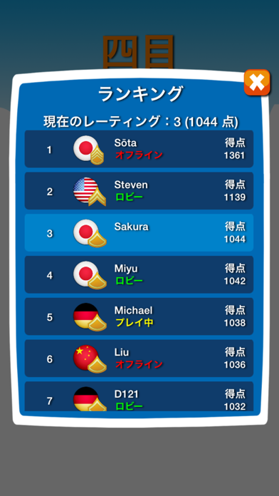 四目並べは二人対戦のクラッシクな卓上ゲームです。交互にコマを重ねて、先に縦・横・斜めいずれかに4つ並べた方が勝ち!自分の直線を守りながら、コンピュターと、友達と、世界中の人たちと対戦しよう!